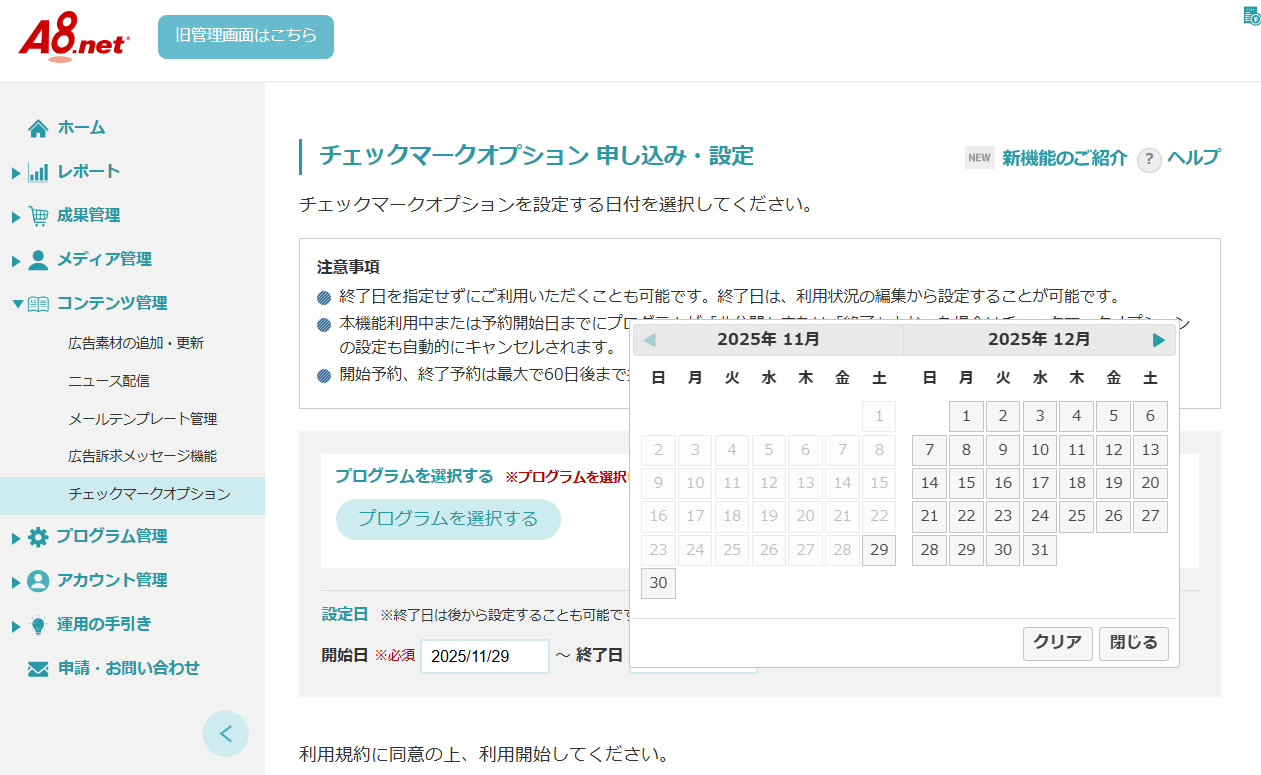 旧管理画面では、チェックマークオプションの開始・終了のどちらの設定も、