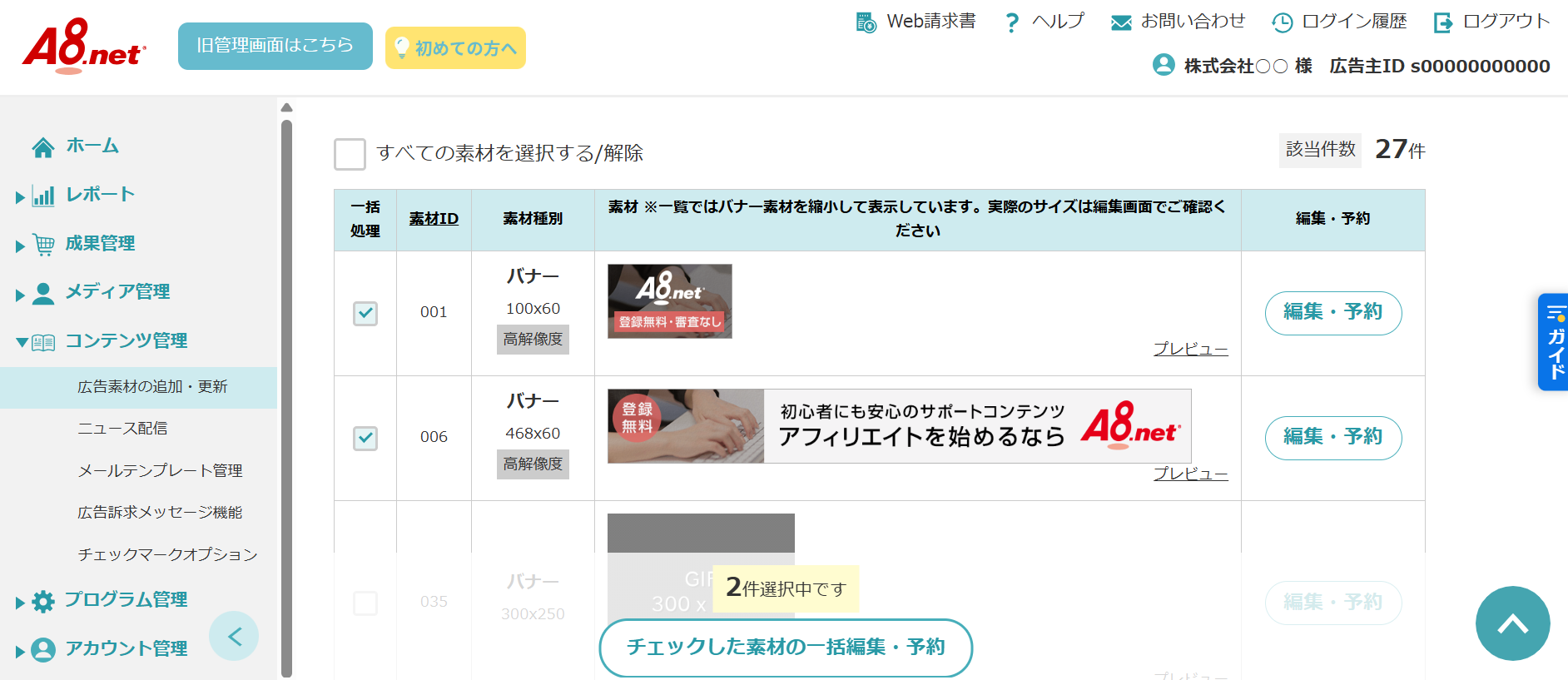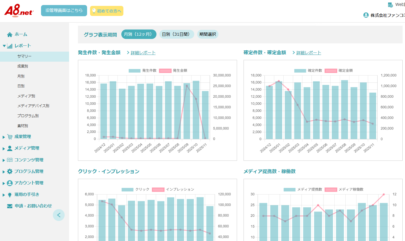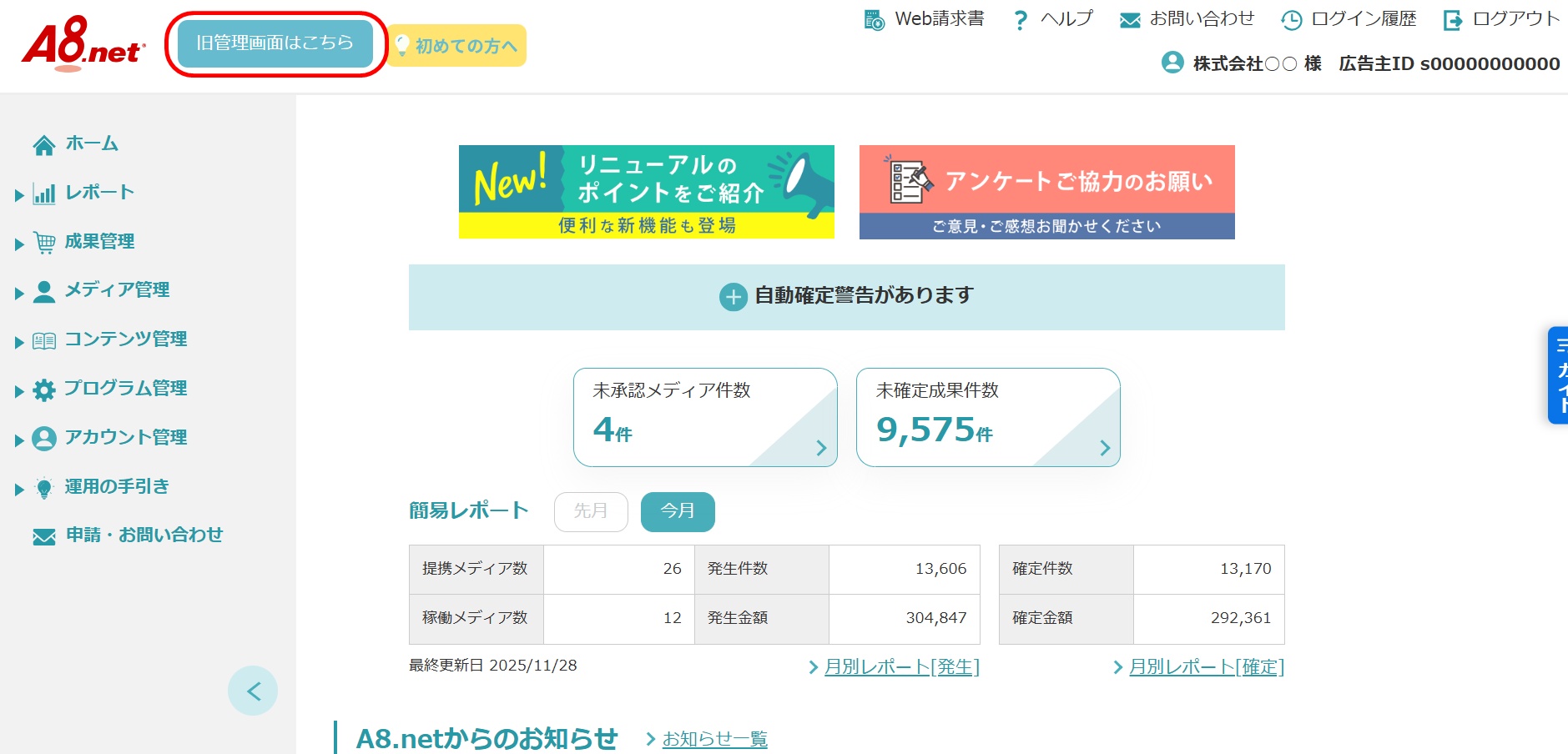 A8.netでは本日(2025年12月4日)より、広告主管理画面のデフォルト画面を旧管理画面から新管理画面に切り替えを実施いたしました。