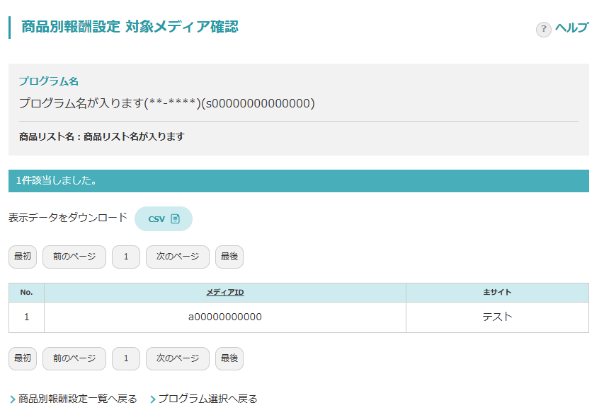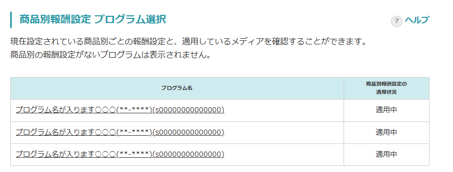 商品別報酬設定では、商品別の成果報酬の設定やメディア別の設定を確認をすることができます。