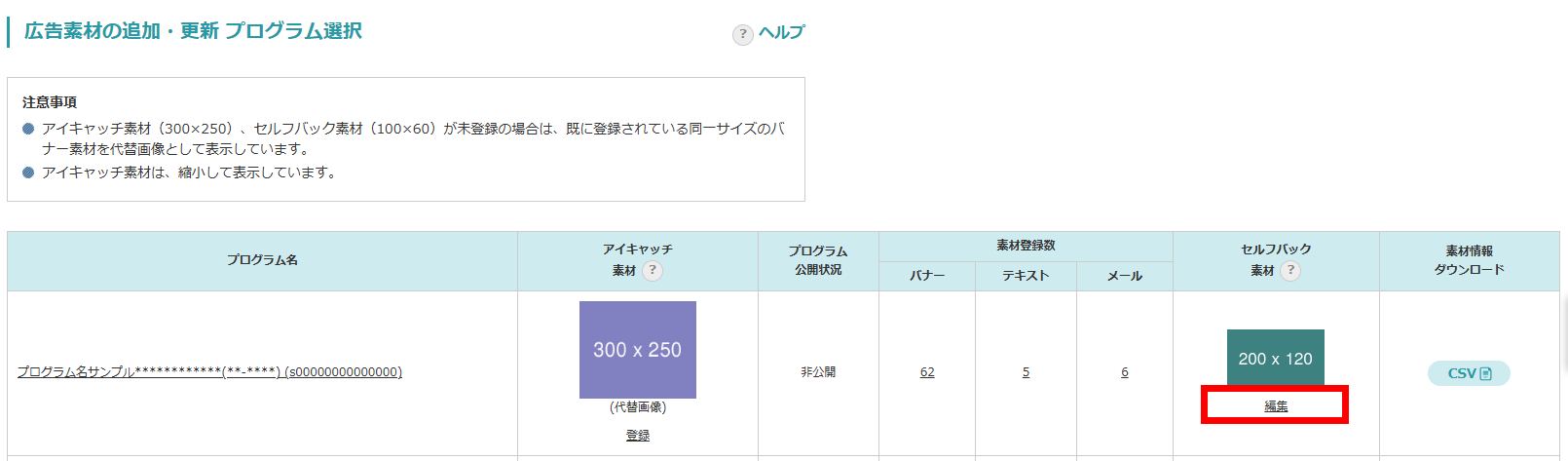プログラム一覧で、現在のセルフバック素材を確認できます。
