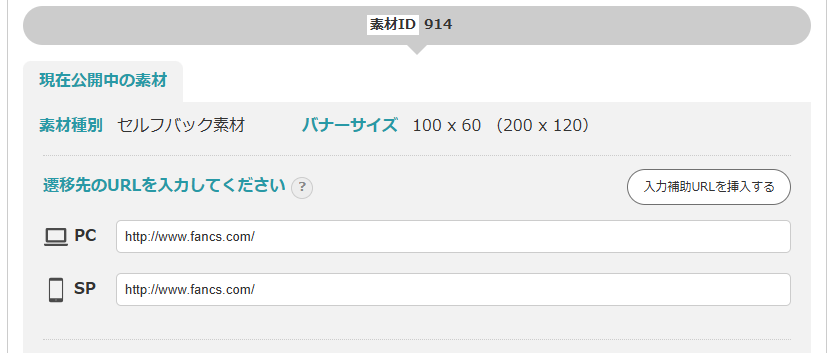 セルフバック素材では、セルフバックで表示されるバナーと遷移先の設定ができます。