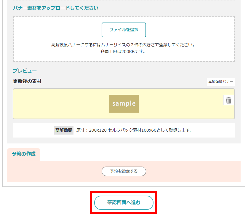 プレビューを確認し、画像と遷移先に問題がなければ、【確認画面に進む】ボタンをクリックします。